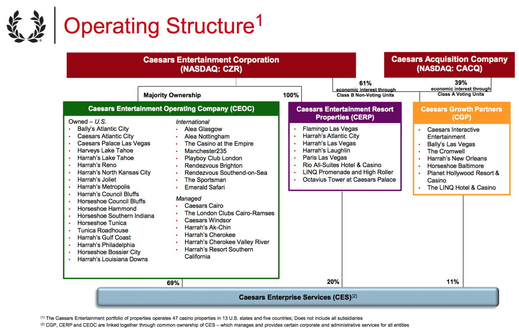 What's important to note here is that CEOC is bankrupt and Caesars Growth Partners (CGP) is 39% owned by Caesars Acquisition Company (NASDAQ: CACQ). The only wholly owned unit is Caesars Entertainment Resort Properties (CERP), which owns a mishmash of properties in Las Vegas, Atlantic City, and Laughlin.