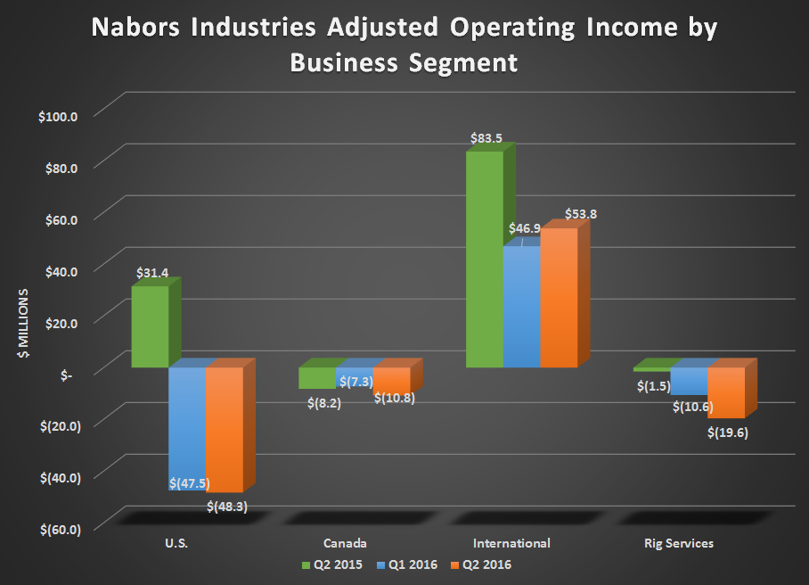For the most part, Nabors' decline in earnings year over year was a reflection of the overall market for rigs in general. The active rig count in the US declined throughout the quarter and only started to increase at the end of the quarter. Nabors averaged 44 active rigs in the US for the quarter. The company did note, though, that it did get a little revenue bump from increased standby revenue on its MODS 400 offshore platform rig for the Gulf of Mexico.