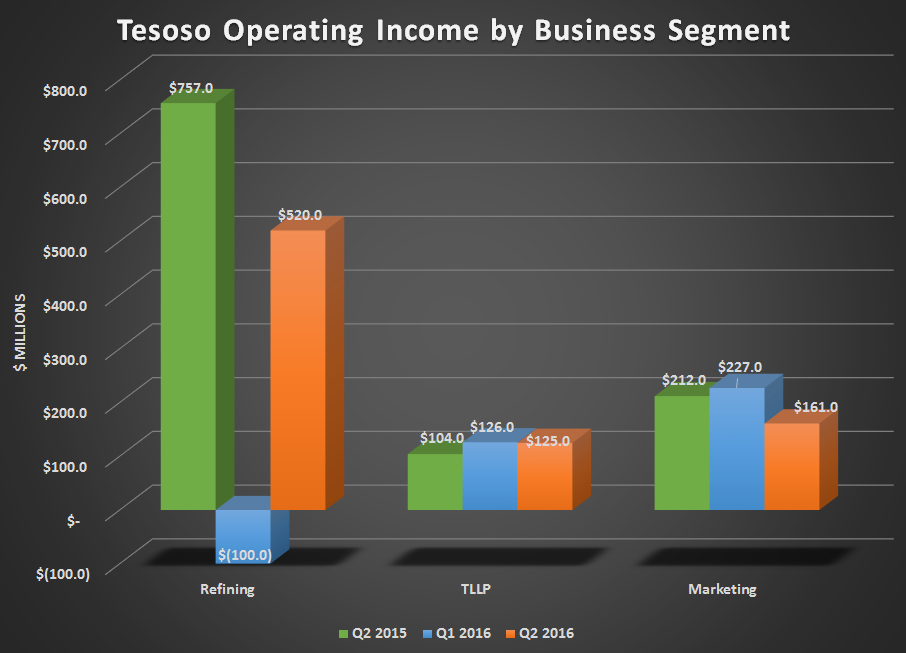 This was a pretty busy quarter for Tesoro on the acquisition front. First, it acquired wholesale marketing and logistics assets in Alaska from privately held Flint Hills Resources. It then immediately dropped those assets down to Tesoro Logistics Partners on July 1st for $400 million in cash and $44 million in new Tesoro Logistics shares. The deal is expected to close this quarter.