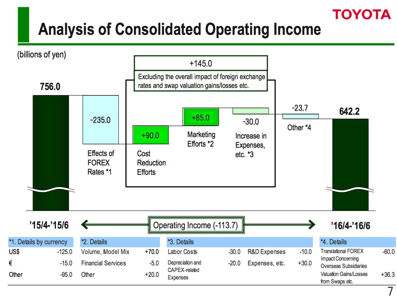 As the above slide from Toyota's earnings presentation shows, Toyota was able to offset the exchange-rate hit to some extent. CEO Akio Toyoda's ongoing cost-reduction efforts helped, as did a modest 2.7% year-over-year increase in vehicles sold along with improvements to "mix," the ratio of more-profitable vehicles to less-profitable ones.