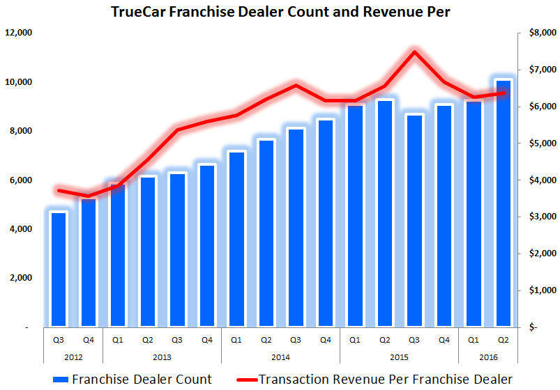 What's important about this graph is that it shows TrueCar is improving its ability to generate revenue from dealerships at a higher rate during the recent quarter. For instance, in Q2 of 2015, you can see that revenue per dealership spiked because the dealership count shrank, yet the number of TrueCar website customers remained roughly the same -- thus the same revenue potential was spread among fewer dealerships.