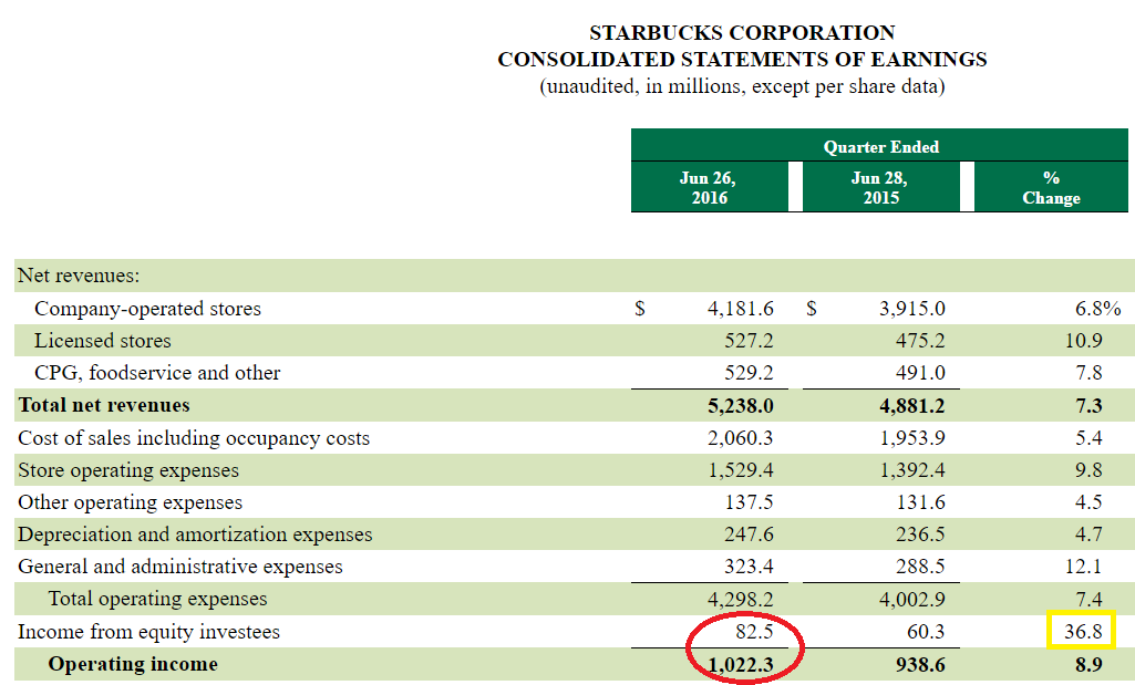 In this detail from Starbucks' condensed statement of operations, you can see that the organization counted $82.5 million in income from equity investees in Q3 2016. This particular line item has been expanding steadily as of late; it's now equal to 8% of total operating income, and was, by far, the fastest-growing component of operating income during the quarter, at nearly 37% expansion versus the prior year.