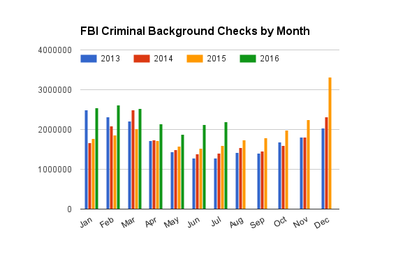 There's good reason both publicly traded gunmakers have been shooting out the lights: The FBI has been working furiously to keep up with the demand for guns. Last month, it conducted almost 2.2 million criminal background checks of individuals wanting to buy a firearm, a record for the month of July. But it's getting accustomed to the workload as every month since May 2015 has broken previous records. The law enforcement agency ended up performing 23.1 million investigations last year, more than at any time in the past, but it's on track to far surpass that number in 2016, having already conducted 32% more investigations this year than it did at the same time a year ago.