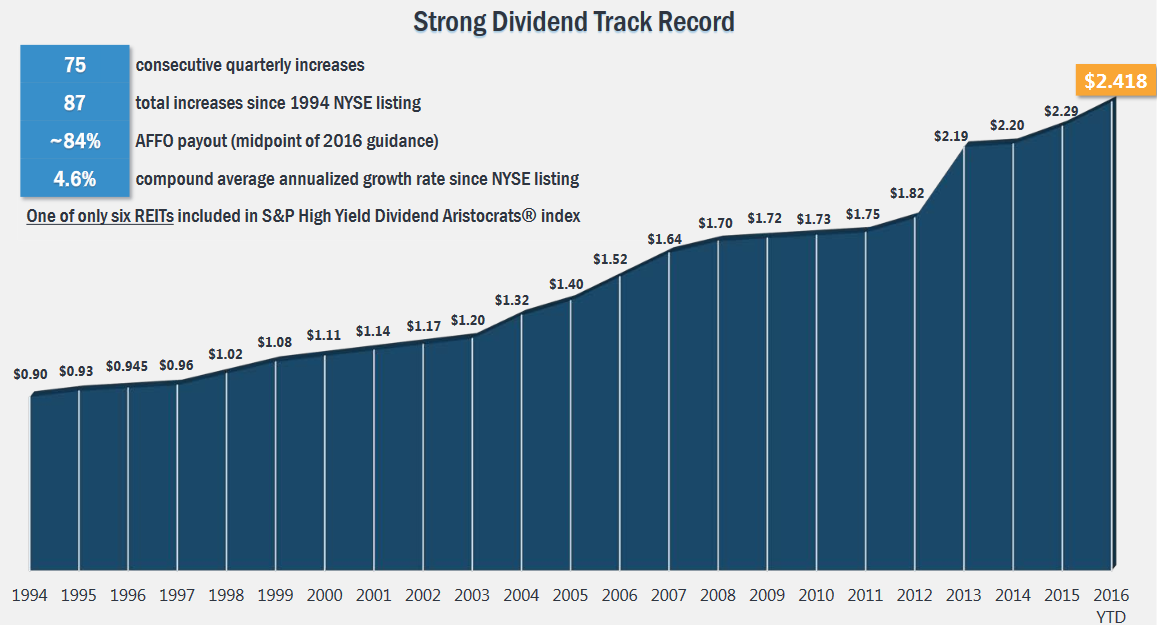 During the first half of the year, Realty Income completed $663 million in acquisitions at record high spreads relative to the cost of capital. In fact, Realty Income is so optimistic about the current investment opportunities in the market that it increased its projections for the full year. As CEO John Case said in the second-quarter earnings release: "We continue to see an ample pipeline of investment opportunities. As a result, we are raising our 2016 acquisitions guidance to approximately $1.25 billion from our prior estimate of $900 million."
