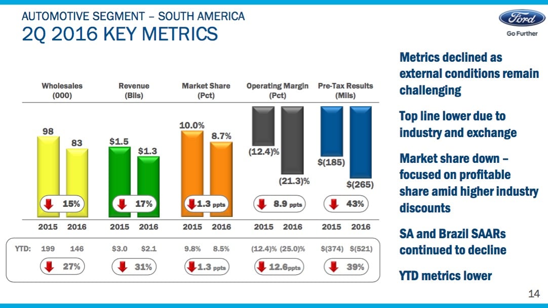 "South America [in the second quarter] was a story that is very much what it has been over the last number of quarters," CFO Bob Shanks said during Ford's second-quarter earnings call. "External conditions, particularly in Brazil continue to be pretty challenging. We saw a decline in the top line as you can see, double digits. Revenue was down 17%. That decline is entirely due to the weaker currencies. Market share was down as we focused on the most profitable parts of our portfolio, amid increasing discounts across the industry. You can see the results in terms of margin and pre-tax results. This is largely what you have been seeing through the first half [of 2016]. I will say that [Ford's executive team in South America] continues to do a good job of focusing on the things that it can manage, particularly on cost."