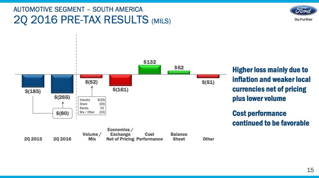 The next slide shows the factors that helped and hurt Ford's second-quarter result in South America versus its result from the second quarter of 2015.