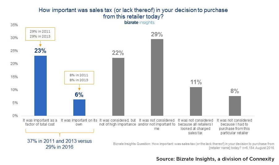 A combined 29% of consumers considered sales tax on its own (6%) or sales tax as part of overall price (23%) as a factor in making a decision to purchase from an online retailer. That's down from 37% who considered it a factor in 2011 and again in 2013. In total, about 70% of consumers either do not factor in sales tax or they consider it but do not give it a high level of importance, according to the research.