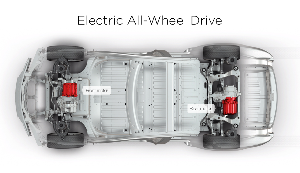 Tesla's dual-motor all-wheel drive technology boosts driving range. Image source: Tesla Motors.