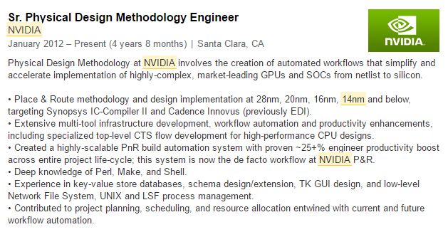 So what evidence is there? Well, take a look at this LinkedIn profile of an NVIDIA senior physical design methodology engineer: