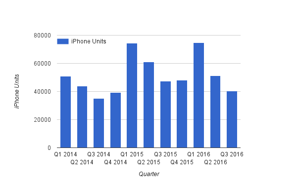 Most customers don't upgrade their iPhones every year, so massive sales in 2015 represent quite a challenge for Apple in 2016. To put the numbers in perspective, the company sold 40.4 million iPhone units in the third quarter of fiscal 2016, which is a 15% increase versus the same period in 2014, but still down by 15% versus the third quarter in fiscal 2015.