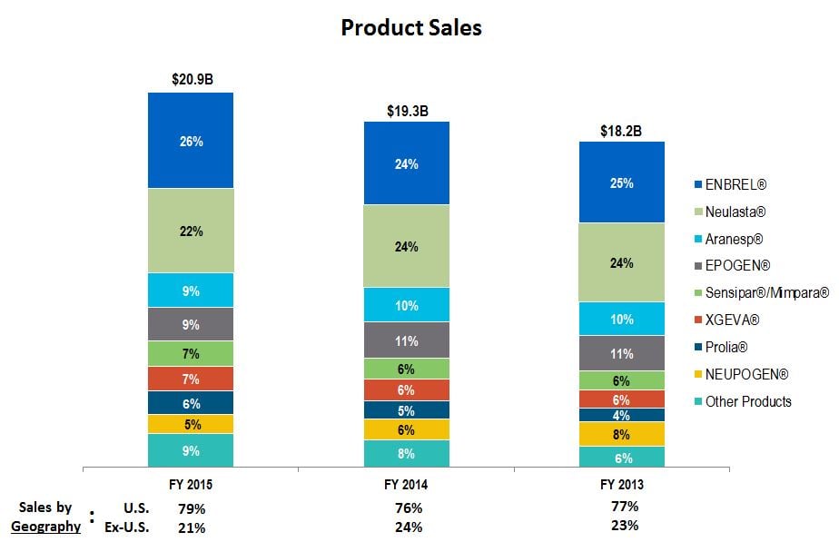 Amgen's other products are growing, but reliance on Neulasta and Enbrel hasn't waned. Combined, the pair still contributed 48.5% of total revenue in the first half of this year. Offsetting eventual losses to biosimilar pricing pressure for key products will be an enormous challenge in the years ahead.