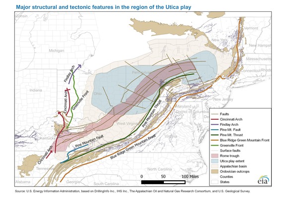 While Ohio is the center of the Utica drilling boom, the shale itself underlies not just eastern Ohio, but also most of West Virginia and Pennsylvania, as well as parts of New York, Virginia, and Maryland: