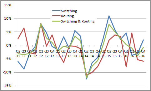 Cisco's business is changing. Its core switching and routing products are growing slower than its non-core revenue. For example, a look at revenue growth for switching and routing (the combined figure is also included) shows lackluster growth in recent quarters.