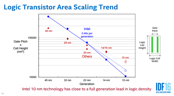 According to the company, its 14-nanometer technology -- using the metric of transistor gate pitch multiplied by logic cell height -- is a little less dense than competitors' upcoming 10-nanometer manufacturing technologies. Intel's own 10-nanometer technology, per this comparison, will be dramatically ahead of the competition in this metric (though it's worth noting that Intel's 10-nanometer technology should come a bit later than the competitions').