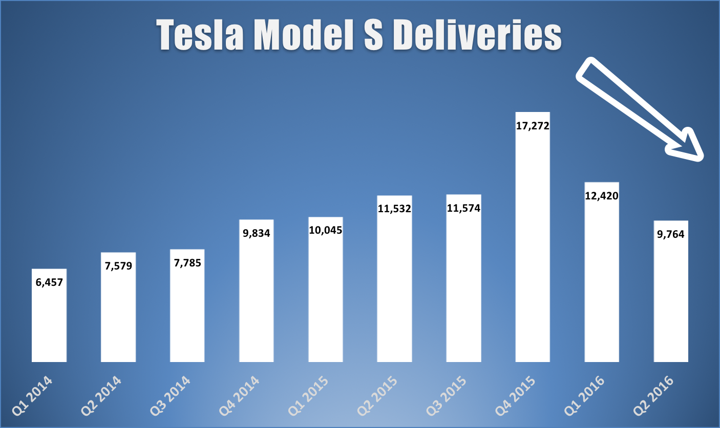 It's easy to see why some investors might be concerned about Model S sales. Between the fourth quarter of 2015 and the first quarter of 2016, Model S deliveries were down 28%, and they fell another 21% in Q2. Sure, second-quarter Model S deliveries were up 24% year over year, but these sequential declines are still concerning given how steep they are.