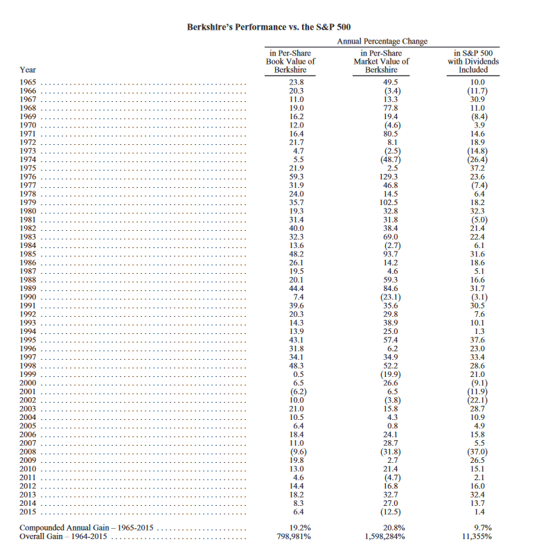 Finally, take a look at the first column of performance figures, which is the book value change of Berkshire shares throughout the years. In 51 years, the company's book value grew in 49 of them. This is one of Warren Buffett's main goals: increase the company's earning ability every year, and performance will follow.