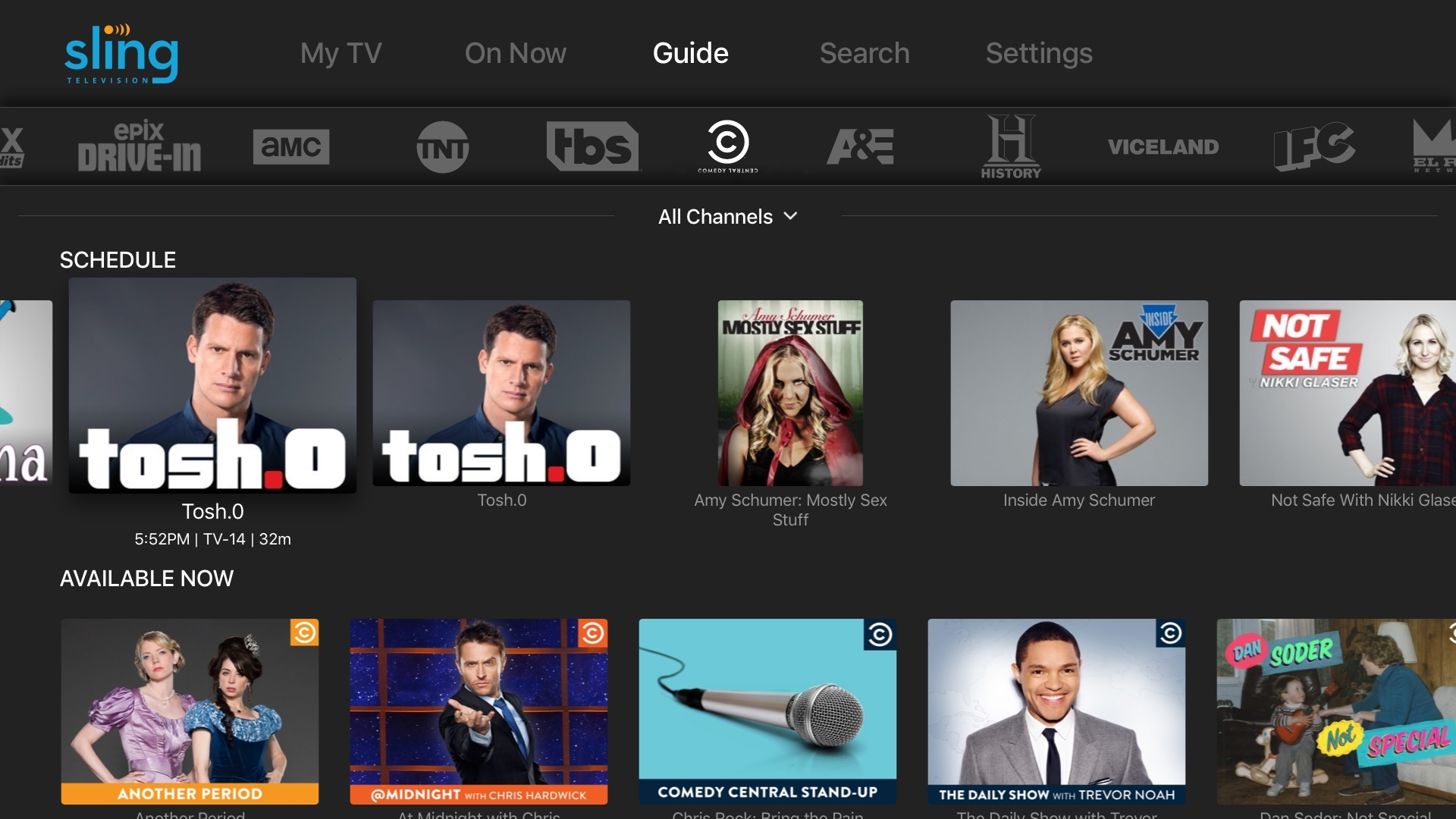 Sling proved to be more user-friendly and even has a mode that lets you easily scan through what's on now. Unfortunately, the lack of a DVR and inability to pause or rewind most live shows made using it ultimately unsatisfying. Sling is cheap, but in most cases it requires you to sit through the commercials.
