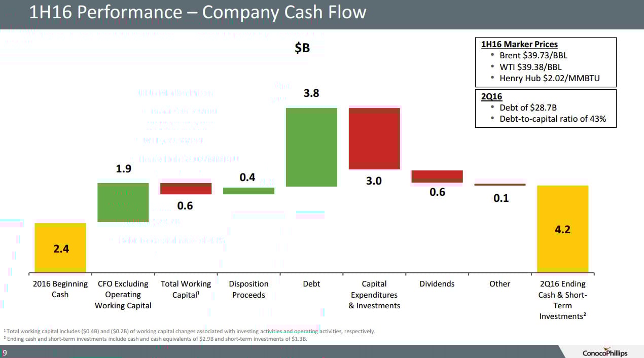 That said, while the industry is more efficient at getting oil out of the ground, production costs have not come down quite as dramatically. Because of that, ConocoPhillips' cash flow is still feeling the impact of low oil prices.