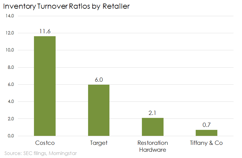 Contrast these two luxury businesses with Target and Costco, which primarily sell food products and home goods. It's only natural that their product mix of commodity goods would get turned over much faster than specialty furniture or jewelry. (That a significant portion of space on Costco and Target shelves is dedicated to perishable foods also necessitates faster inventory turns, as too much inventory will lead to spoilage.)