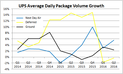 However, in recent quarters, UPS has started to report a pick-up in volume growth in its premium next-day-air deliveries. For reference, UPS's next-day-air average revenue per piece in its second-quarter was $19.51 compared to $8.11 for its ground packages. As you can see below, next-day-air has been doing well recently.
