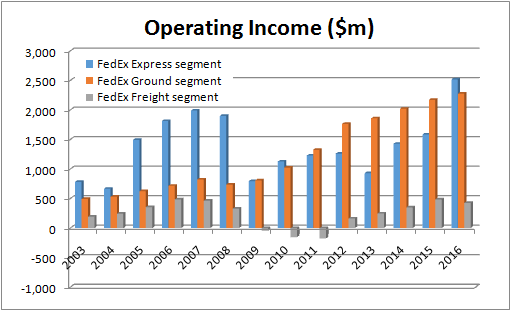 Turning back to FedEx, on the fourth-quarter earnings call, CFO Alan Graf outlined expectations for ground revenue and operating income to increase in FedEx's fiscal 2017. That's the good news, but he also signaled that ground margin would "be negatively impacted by higher operating costs in FY17, driven again by network expansion. Other operational costs may also impact margins as residential volumes grow from e-commerce."