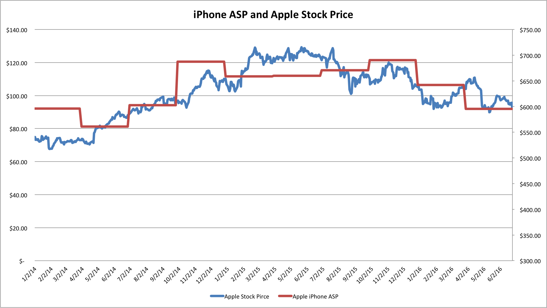 For product-driven companies like Apple, ASP calculations provide pivotal information about its financial performance and, by extension, the performance of its stock price. In fact, there's a clear relationship between Apple's iPhone ASP and its stock price movements: