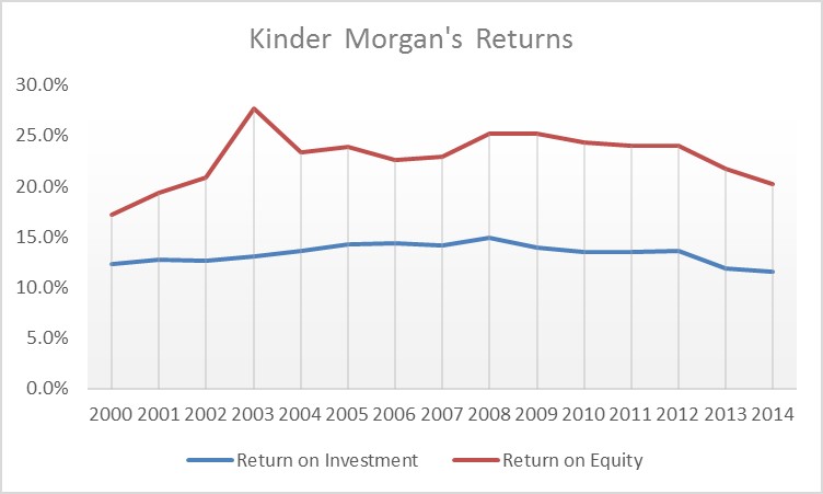 Kinder Morgan's debt rose because it borrowed money to grow. Unfortunately, the economics of the assets it bought or built were not quite as good as those it brought into the fold in earlier years. As a result, the company's investment returns have fallen: