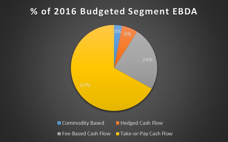 Moreover, 91% of its cash flow is fee-based or take-or-pay. That means Kinder Morgan gets paid irrespective of what commodity prices are doing and in many cases, it gets paid even if its customers are not even utilizing the capacity they had contracted. These agreements provide the company with very stable cash flow that has given it the flexibility to fund growth internally and pay down debt during the downturn.