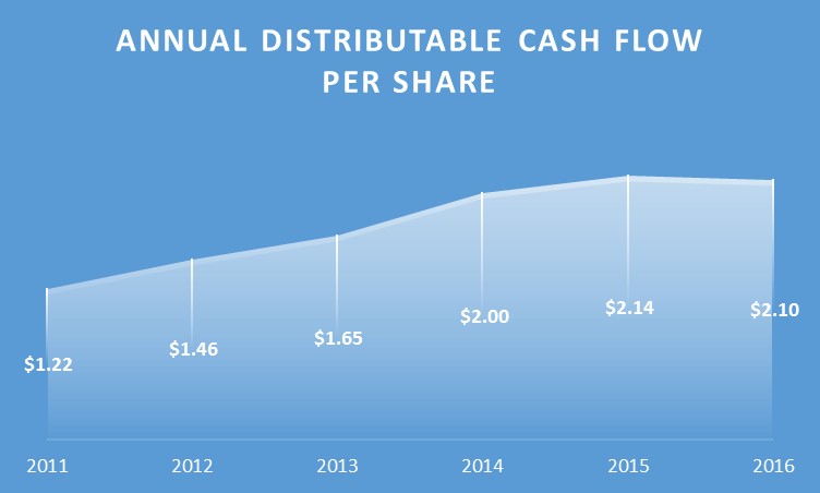 While the energy market downturn impacted Kinder Morgan's ability to borrow money, it has not impacted its cash flow to the same extent. As the chart below shows, its cash flow per share is expected to be just slightly lower than last year's result.