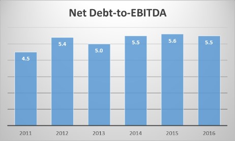 Kinder Morgan's stock started down a slippery slope last fall after the market grew concerned about its leverage amid the worsening oil market downturn. Those concerns hit their zenith in early December when credit rating agency Moody's lowered Kinder Morgan's credit outlook from stable to negative. Further, it warned that the company's debt was at risk of being downgraded, which would cause it to lose its coveted investment grade rating. Most concerning was the fact that Kinder Morgan's trailing twelve-month debt-to-EBITDA reached an unnerving 5.8 times in the third-quarter of 2015. Overall, that key leverage ratio had been on the rise in recent years, which is evident from the following chart: