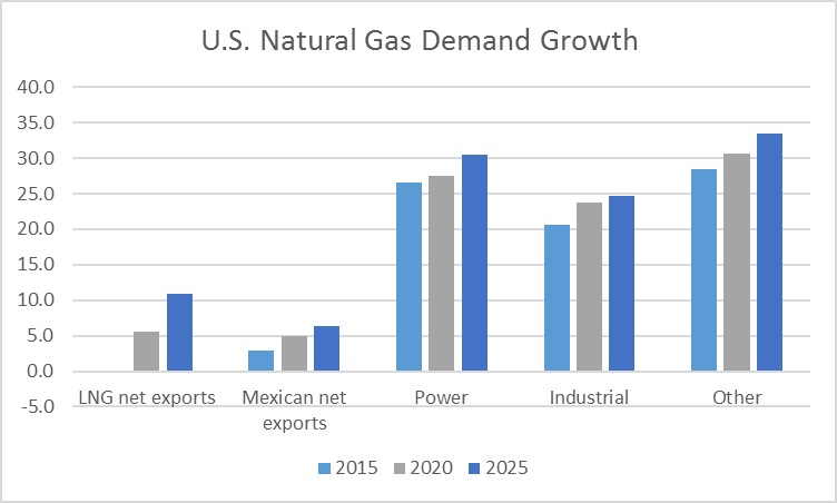 While Kinder Morgan operates several different business segments, it is a natural gas pipeline company at its core given that 57% of its earnings come from that division. That is important because natural gas is projected to become an even more important energy source in the years ahead. According to energy analysts at research firm Woods Mackenzie, U.S. natural gas demand is expected to increase by 35% through 2025, with demand growth driven by several factors: