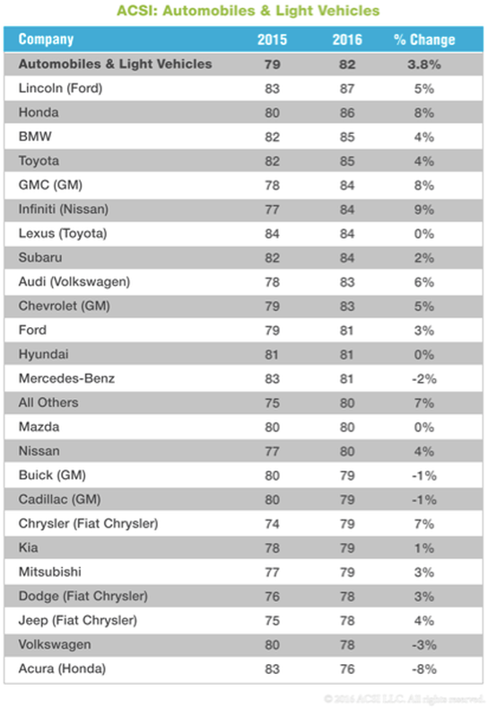 Lincoln took the top spot with a 5% jump, to a score of 87, on the same 100-point scale by ACSI. Second place was owned by Honda, which posted an 8% improvement, to 86. Luxury brands finally cracked the top end, at third place, when BMW and Toyota tied with a score of 85. Further, Lexus, which lost its first-place position to Lincoln, was matched by GMC, Subaru, and Nissan's Infinity, at 84.