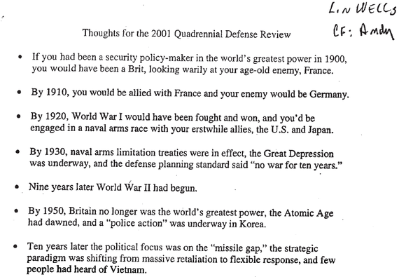 Back in 2001, then-Secretary of Defense Donald Rumsfeld forwarded along a memo to then-President George W. Bush from an analyst at the Pentagon named Lin Wells. Its contents were some musings on the upcoming Quadrennial Defense Review -- a process our government undertakes every four years to try to identify the threats of the future and put in place a long-term plan to manage them.