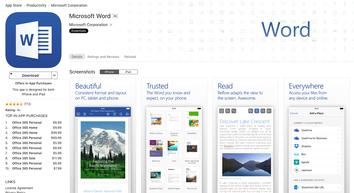 Word is a free download in Apple's app store. Image source: Apple.