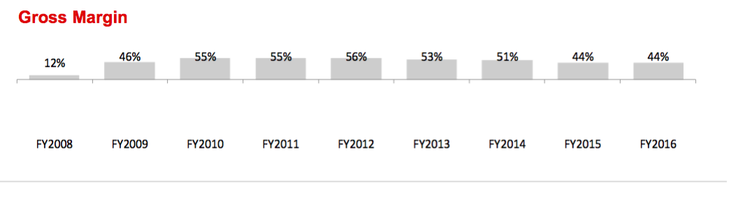 Take a look at how far the company's gross margins have fallen in just a few years: