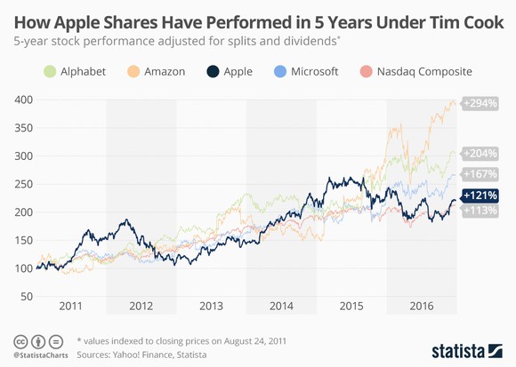 For Apple, so-so isn't good enough, which is why its stock price is essentially flat for the year. Under Cook's leadership, the stock has climbed 121% after adjusting for stock splits and dividends. Slightly more than doubling Apple's share price since Cook took the helm is hardly a bad thing -- except when compared to Alphabet and Microsoft.