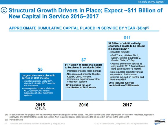 Williams wants to own more of its high-yielding MLP because it believes that the already lucrative payout will go much higher in the future. Driving that outlook is the fact that Williams Partners has roughly $5 billion of fee-based expansion projects under construction that are expected to go into service through the end of 2017: