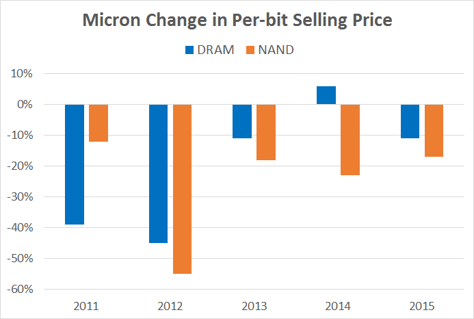 Per-bit prices should generally decrease over time, as devices pack in more memory and manufacturers increase density, but the pace of those declines varies wildly. It's that variation that can cause major problems for Micron.