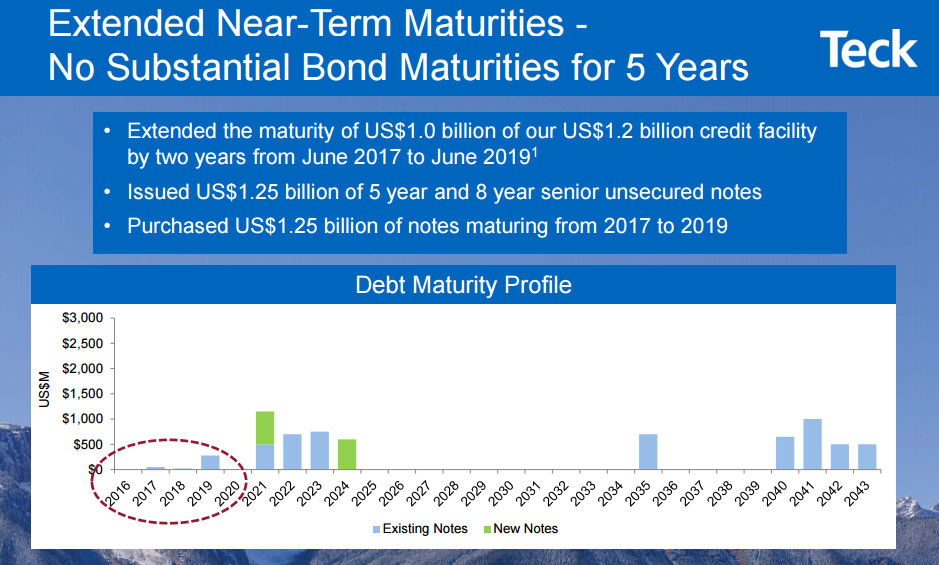 In response, Teck did two very important things. First, the company initiated a tender offer for up to $1.25 billion worth of debt coming due between 2017 and 2019. Second, the company issued $650 million of five-year notes and $600 million worth of eight-year notes. These two moves, along with an extension of the company's credit facility from June 2017 to June 2019, changed the game in a big way.