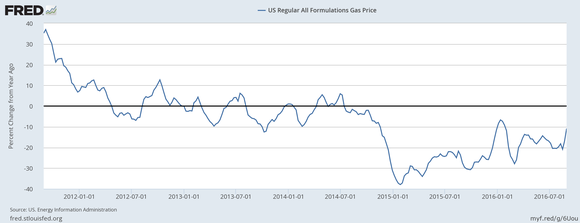 Yet the biggest drag on Costco's sales lately has been from its gasoline business, which has slumped as fuel prices declined. Last quarter, for example, a 20% decrease in average fuel prices pushed gasoline sales down by nearly $500 million.