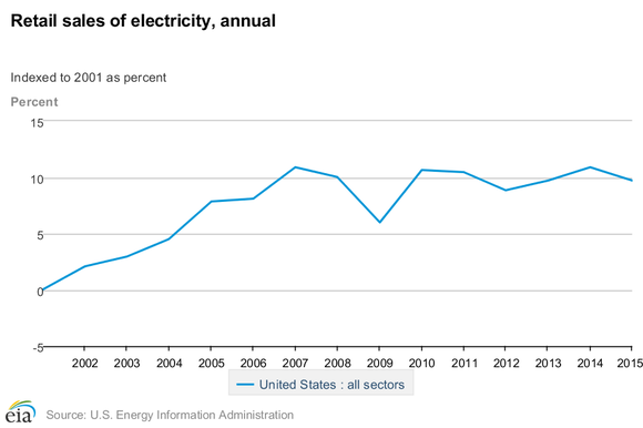 First, let's look at how much electricity U.S. consumers use and how slowly it's growing. From 2006 to 2015, the U.S. consumed about 3.7 billion MWh of electricity annually, or 3,700,000 thousand MWh, as the U.S. Energy Information Administration reports their figures. And demand has been flat.