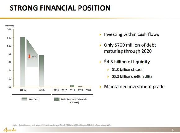 In addition to reinvesting a portion of its asset sale proceeds to grow production out of its North American shale plays, Apache paid down a substantial amount of debt in recent years: