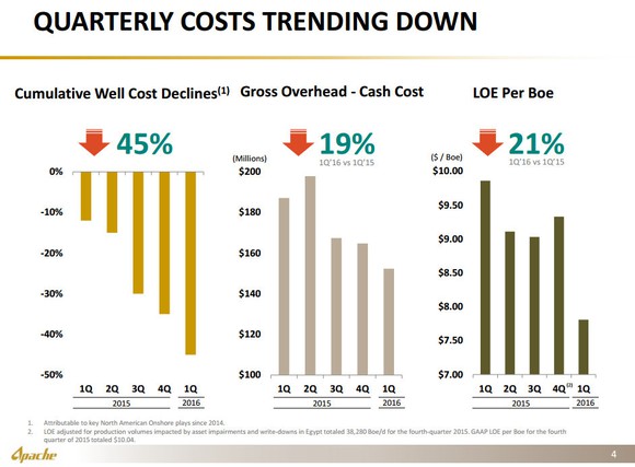 Because Apache did not have to focus any attention on bolstering its balance sheet, it was able to focus entirely on reducing its costs. As these next three charts show, the company's cost structure has dramatically improved over the past year.