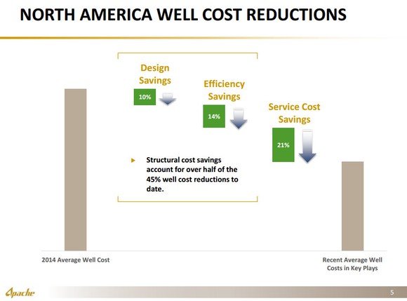 What's worth noting is that, unlike the decline in production costs, which are most likely temporary, about 45% of Apache's well cost savings are structural in nature. What that means is that these cost reductions are immune to the inflationary cost pressures of rising oil prices. In other words, when oil rebounds in the future it will allow oil-field service companies to start raising prices for their services. However, even if service costs went back to their 2014 level, it would only result in Apache's well costs rising slightly because it permanently removed costs through efficiency gains and design changes. What that means is that when oil prices improve, Apache's drilling returns will zoom higher because of these permanent changes to its cost structure.