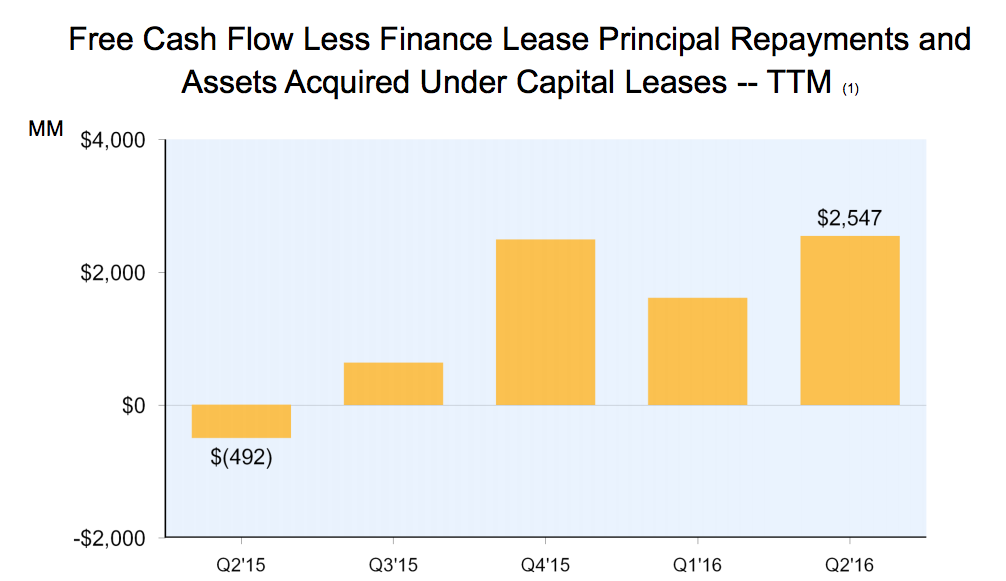Free cash flow less finance lease principal repayments and assets acquired under capital leases amounted to $2.5 billion during the year ended in June, a big improvement versus negative $492 million in the same period last year.
