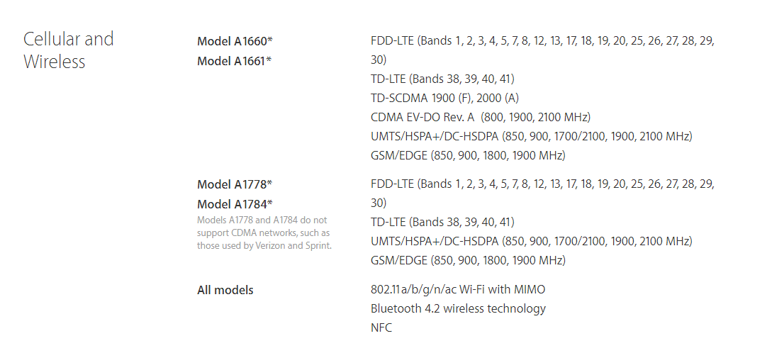 This year, at least in the United States, Apple is offering two models each of the iPhone 7 and iPhone 7 Plus. One variant of each phone will support the CDMA standard (as the specifications above illustrate), while another from each won't.