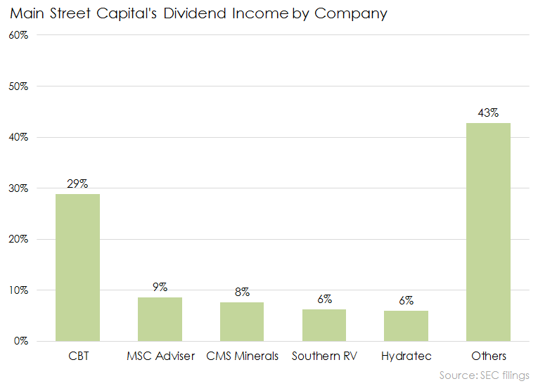 There are some mitigating factors to the lack of diversification in its income. MSC Adviser is an asset manager of permanent assets, so its fee revenue and earnings should be relatively stable. Similarly, CMS Minerals' dividends to Main Street are from preferred stock, which should be a little more stable than dividends from common stock, all else equal. CBT Nuggets has simply been a monster in terms of capital appreciation and its dividend-paying ability, which skews the contribution from others.