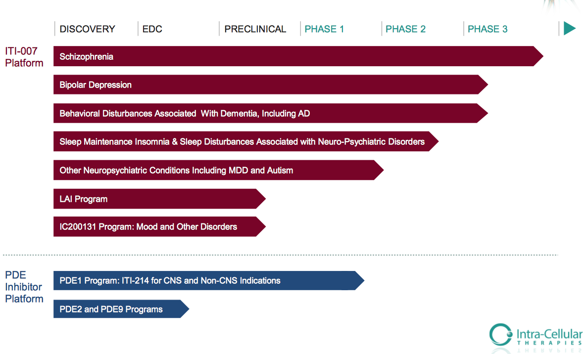 Intra-Cellular is currently running three phase 3 trials to test ITI-007's ability to treat bipolar depression, behavioral disturbances associated with dementia, and schizophrenia. It also has trials in earlier stages testing the drug in a range of other indications.