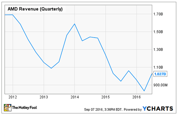 Longtime AMD shareholders will know that the company's revenue has been anything but encouraging over the past few years. Since 2014, the top line has declined by about 39% from its high.