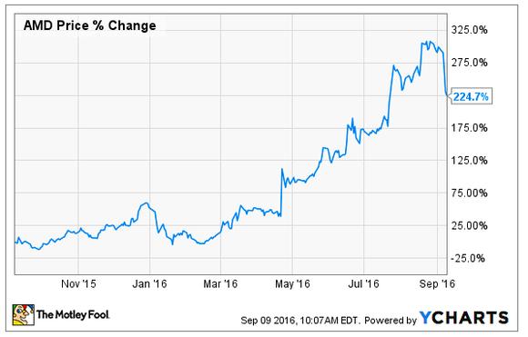 It's hard to write an article showing some of the most important AMD charts without including the company's massive bull run this year. The stock has already more than doubled in 2016, with a nearly 220% gain over the past 12 months.